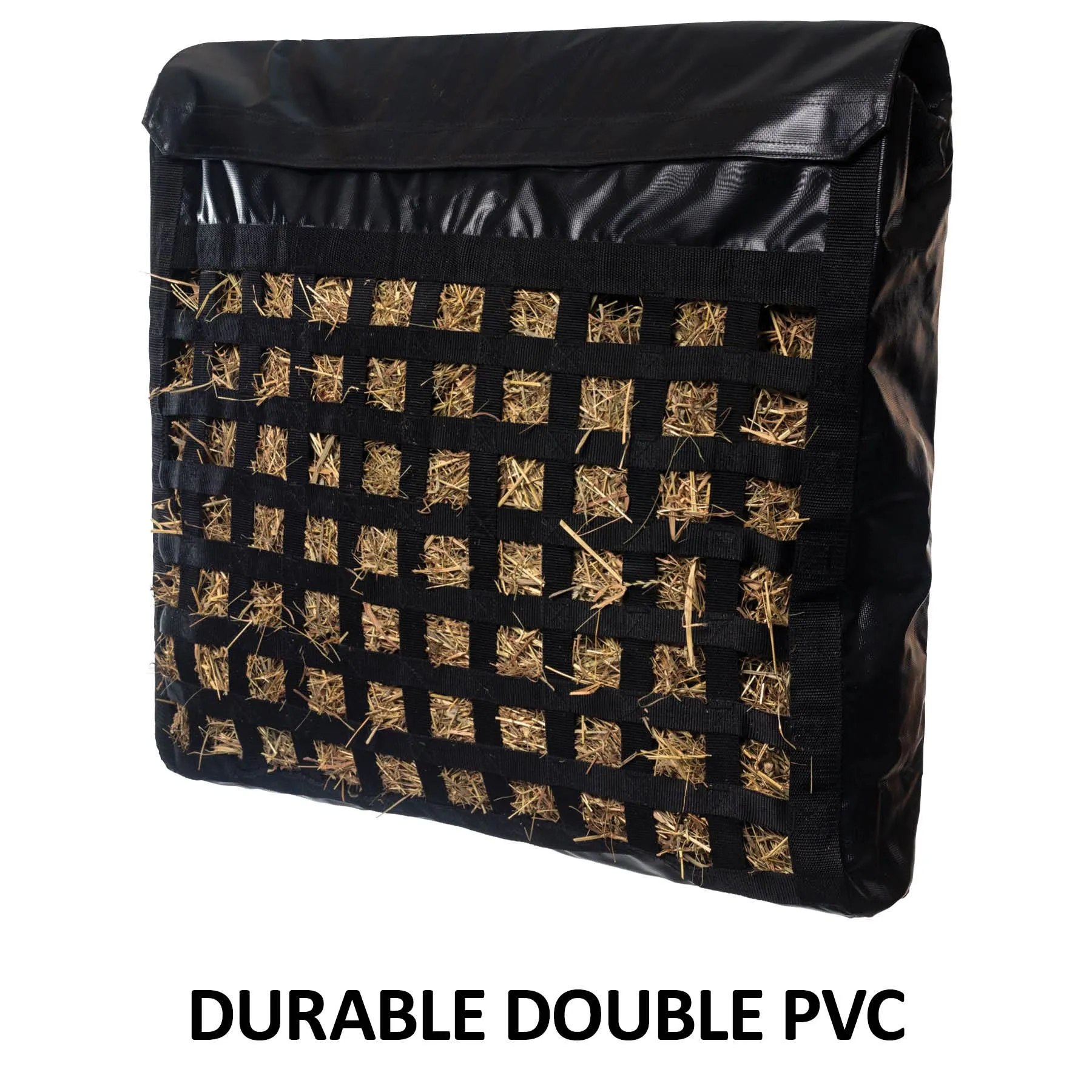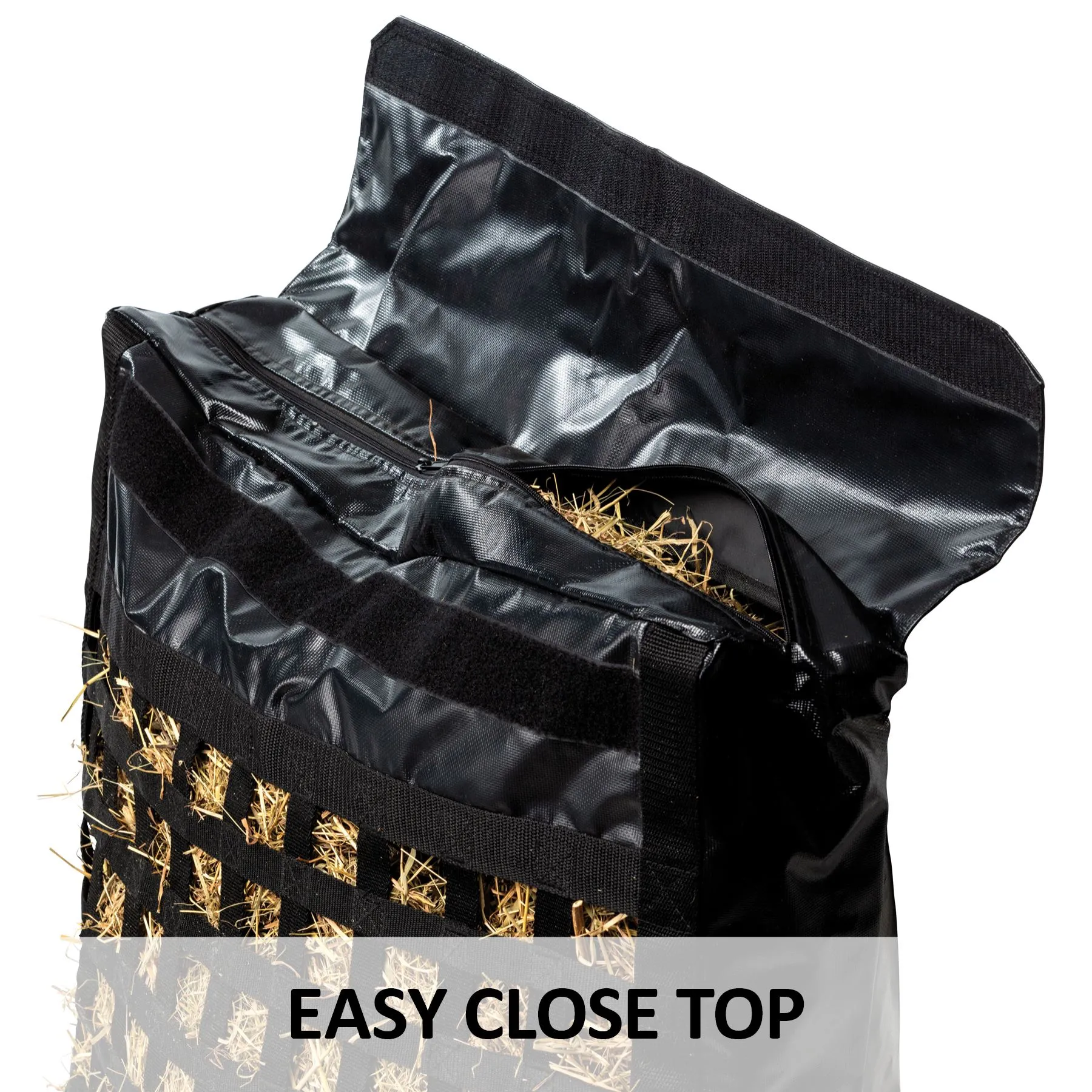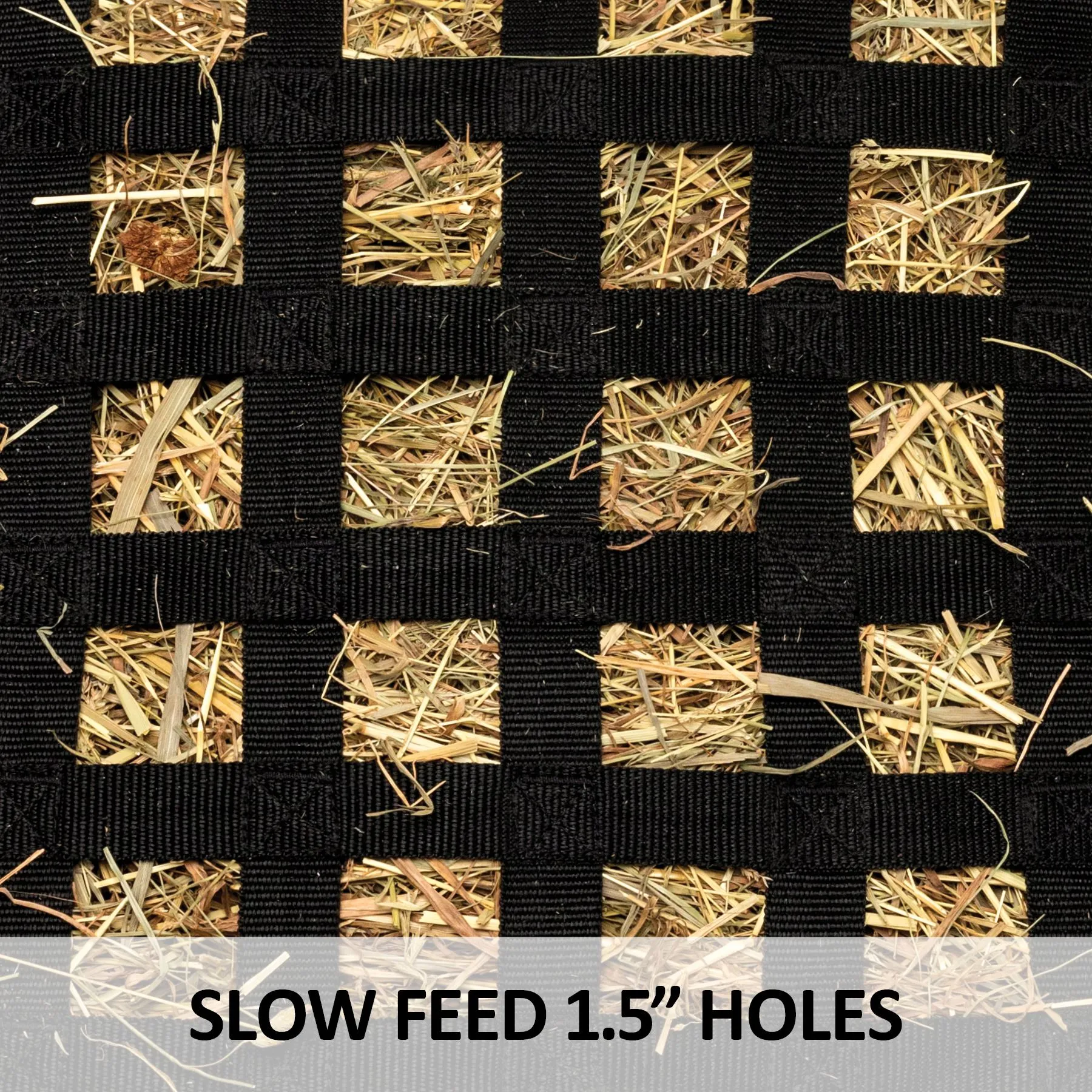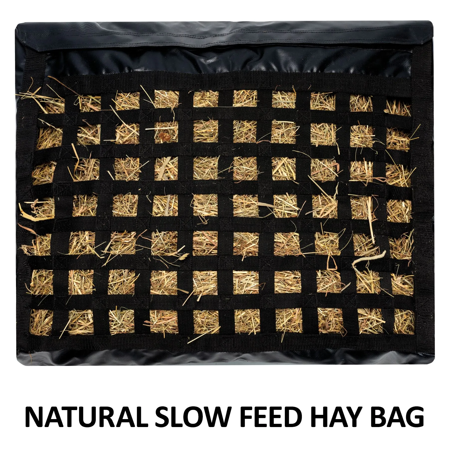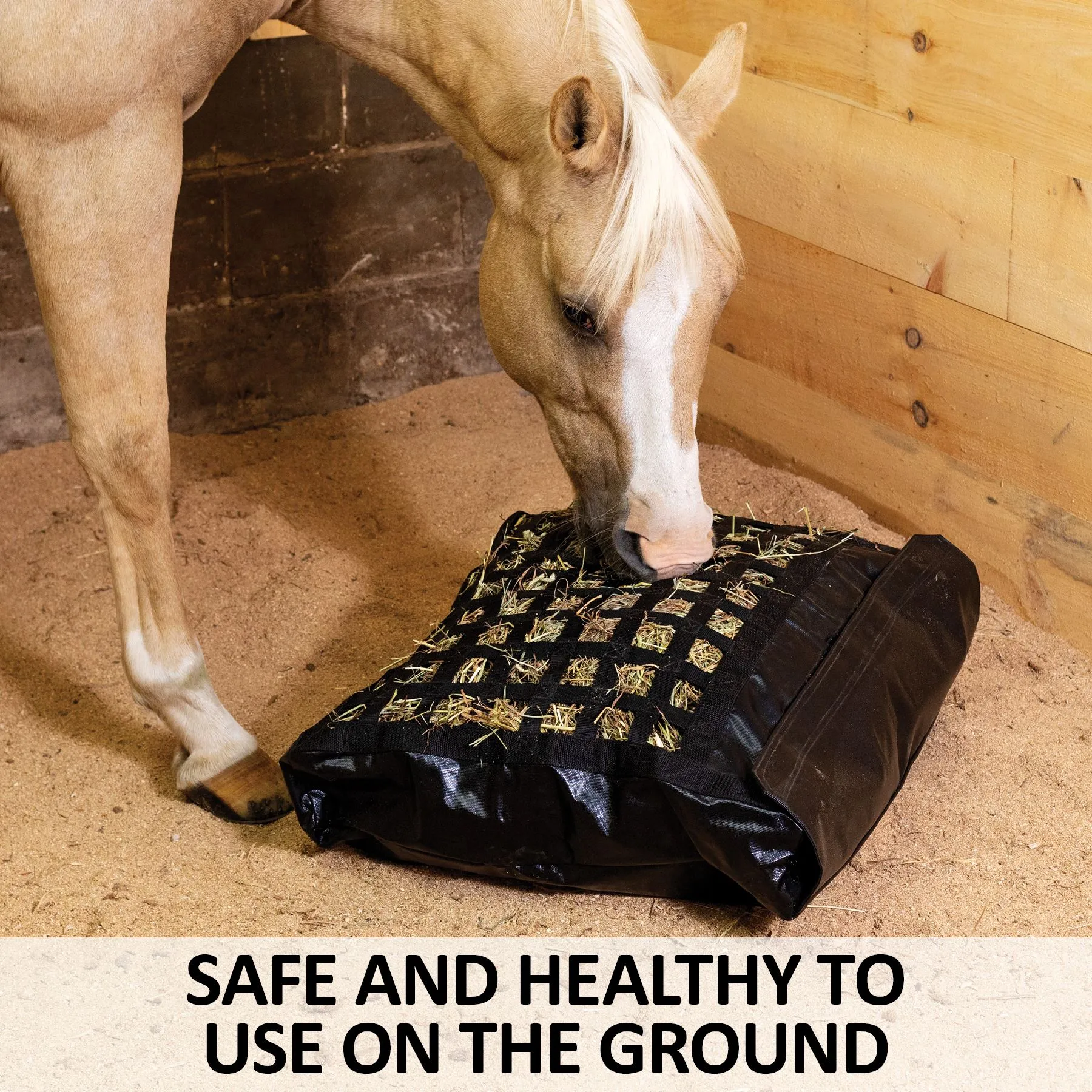 Mimic natural grazing inside your stall and help discourage ulcers with a more natural slow feed hay bag that sits on the ground. This hay bag has 1.5″ webbing slow feed holes and a hidden zipper top with hook and loop flap for safe closure. Made of 600D double PVC vinyl material for double strength durability. Measures 25″T X 28″ L