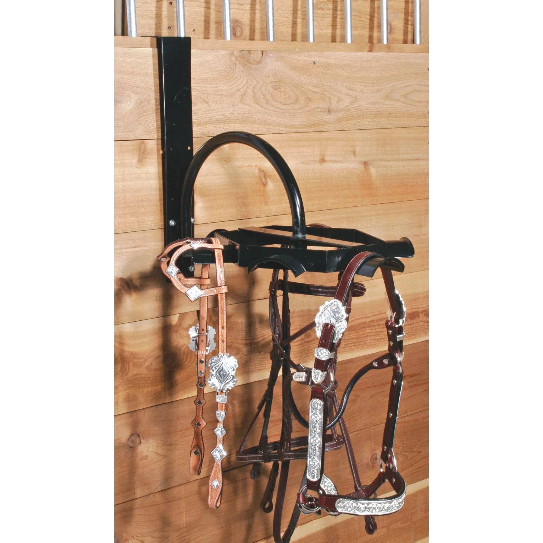 - The Carousel Tack Rack is made of heavy duty steel with a black powder coat finish. The unit features 6 arched racks that provide crown support for halters and bridles. Permanently mounts easily with 4 screws included.