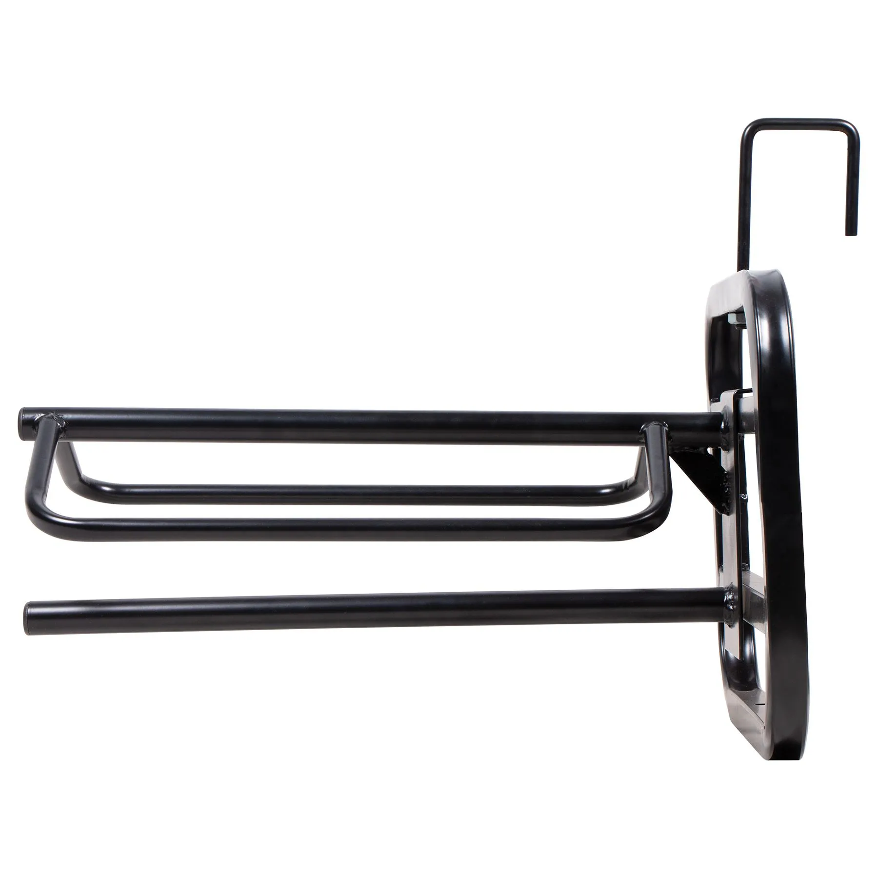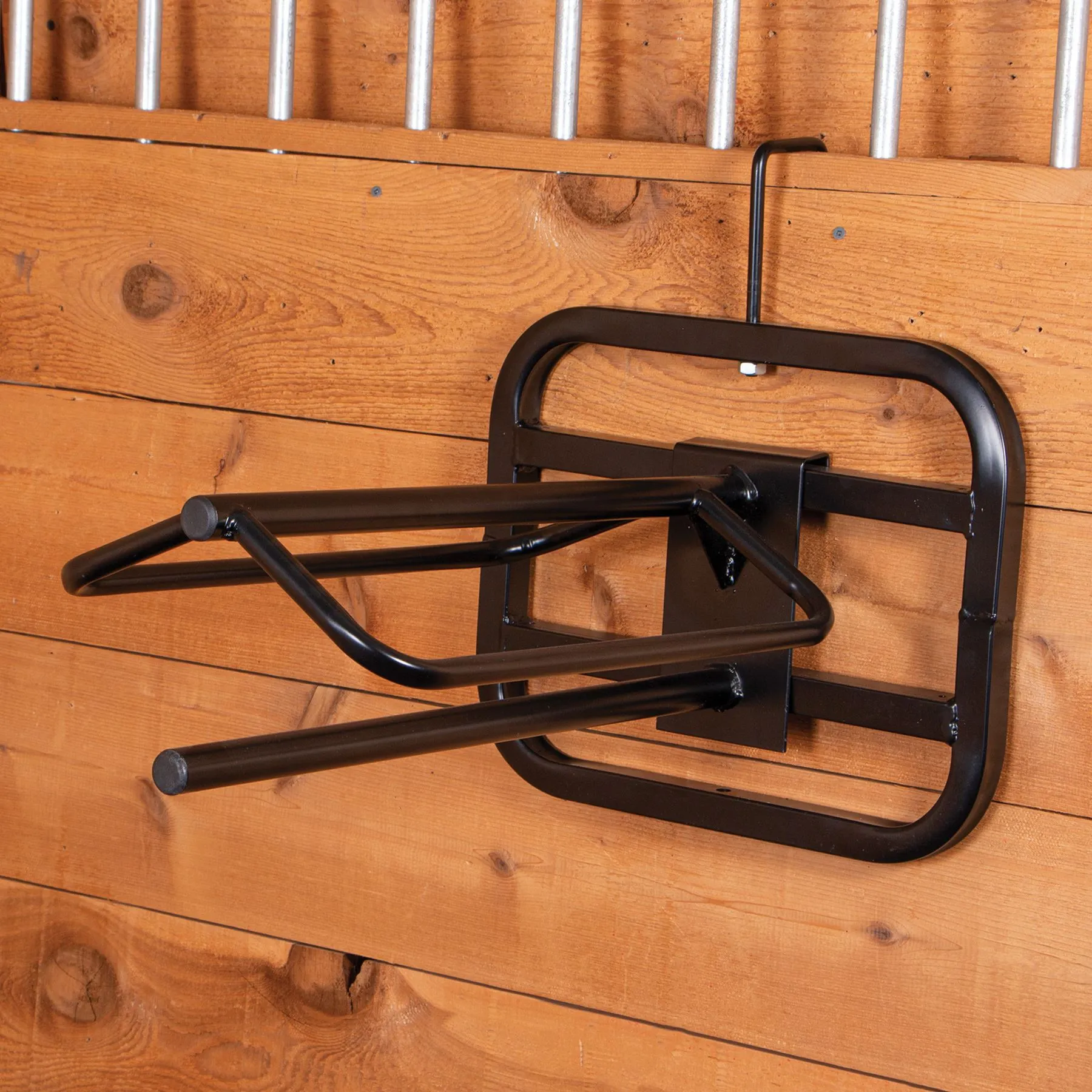 1″ black coated metal hook-over saddle rack can fit between any width space stall bars to hang over the front of your stall. Both the hook and saddle rack are removable for easy tear down and storage, making it a great choice for horse shows. Saddle rack includes a bottom pad rack for drying as well!