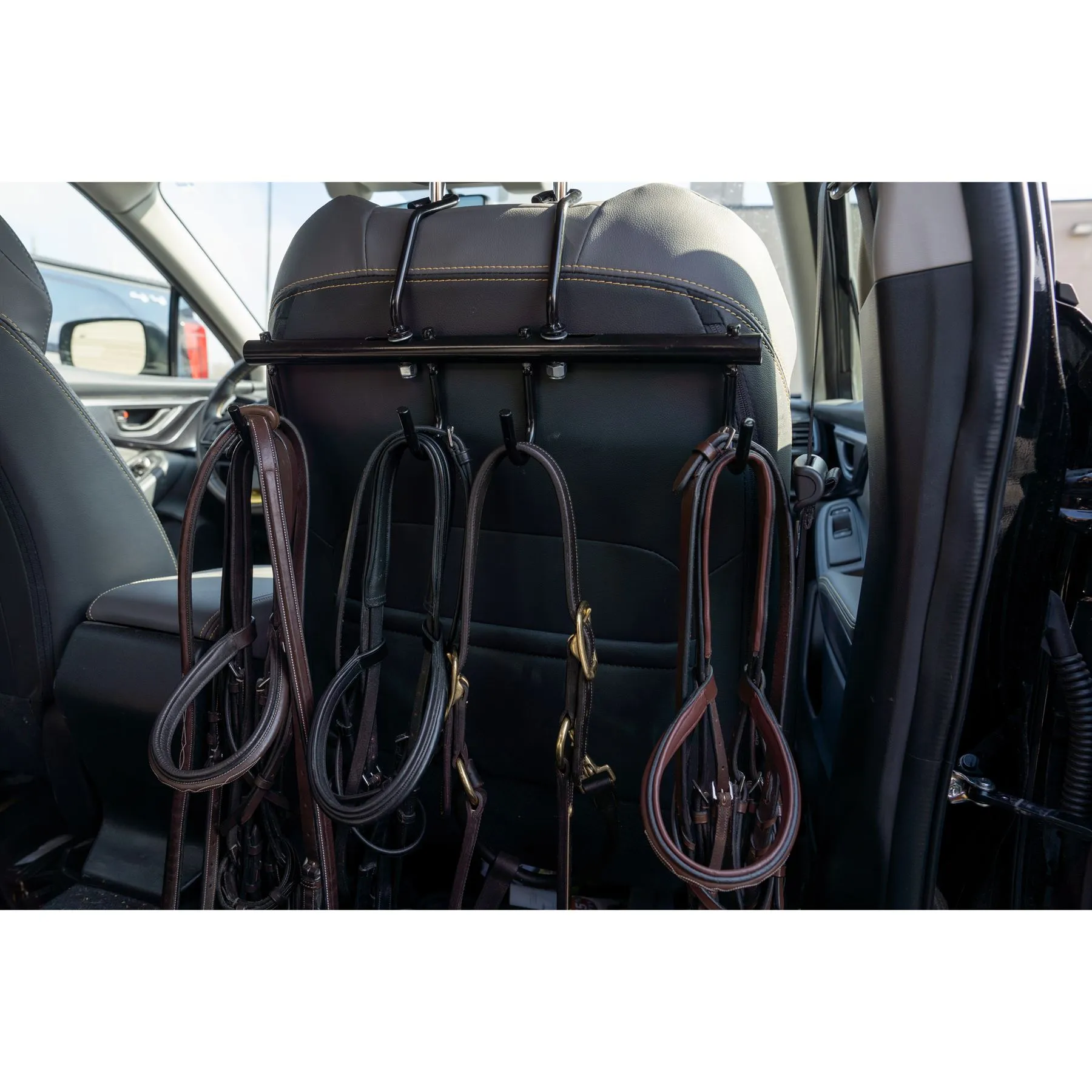 Do you transport your tack to shows or lessons in your car? With the Easy-Up® Multi-Hook Swivel Car Tack Rack, you can keep your bridles, helmets, and bags safe, secure, and off the floor during your travels. This portable 4-hook utility tack rack fits perfectly in most cars, hook and lopping around the headrests with minimal assembly required. The four swivel hooks can even hold various bags when running errands or to keep your vehicle more organized!