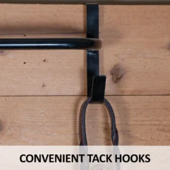 - Portable hanger is 39″ long with hanging hooks that have a 2″ inside width to fit most standard stalls