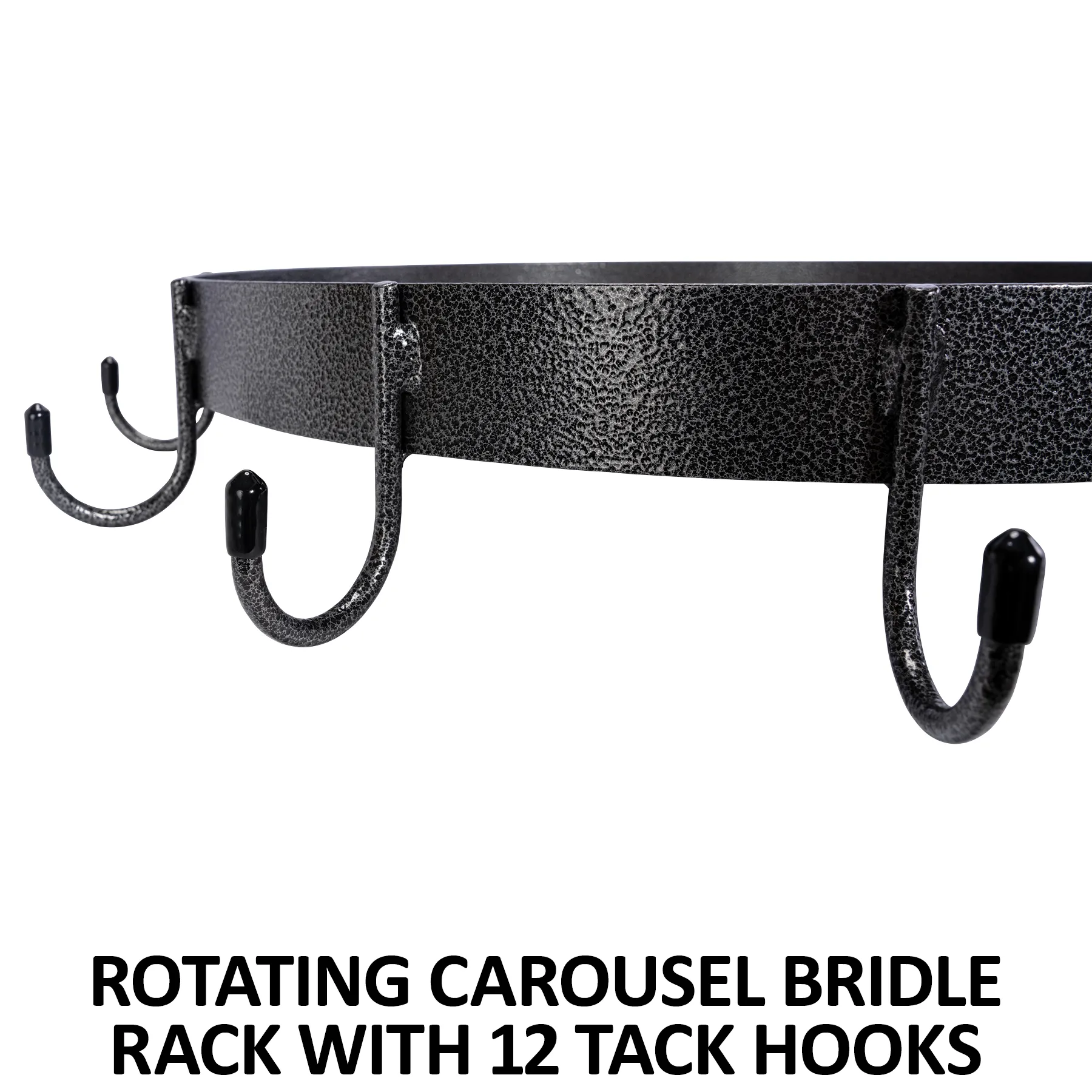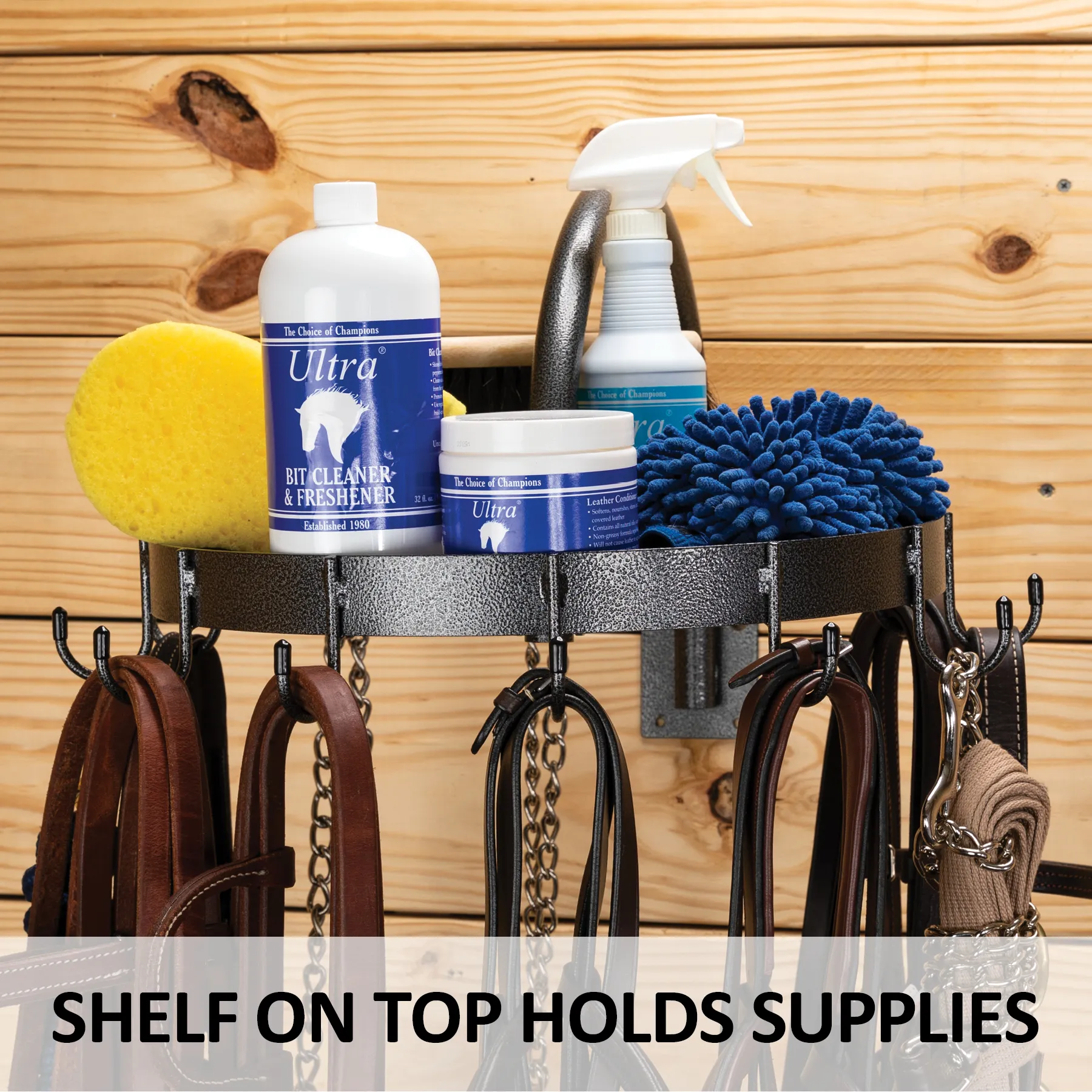 Hang your bridles, halters, cinches, and more on this useful spinning tack rack with a built-in shelf at the top for tack cleaning supplies and other small items. This carousel-style tack rack is made from heavy-duty steel with a black powder coat finish. The upper shelf space is 16″ in diameter. Rack extends 24″ from the wall. Mounting hardware included.