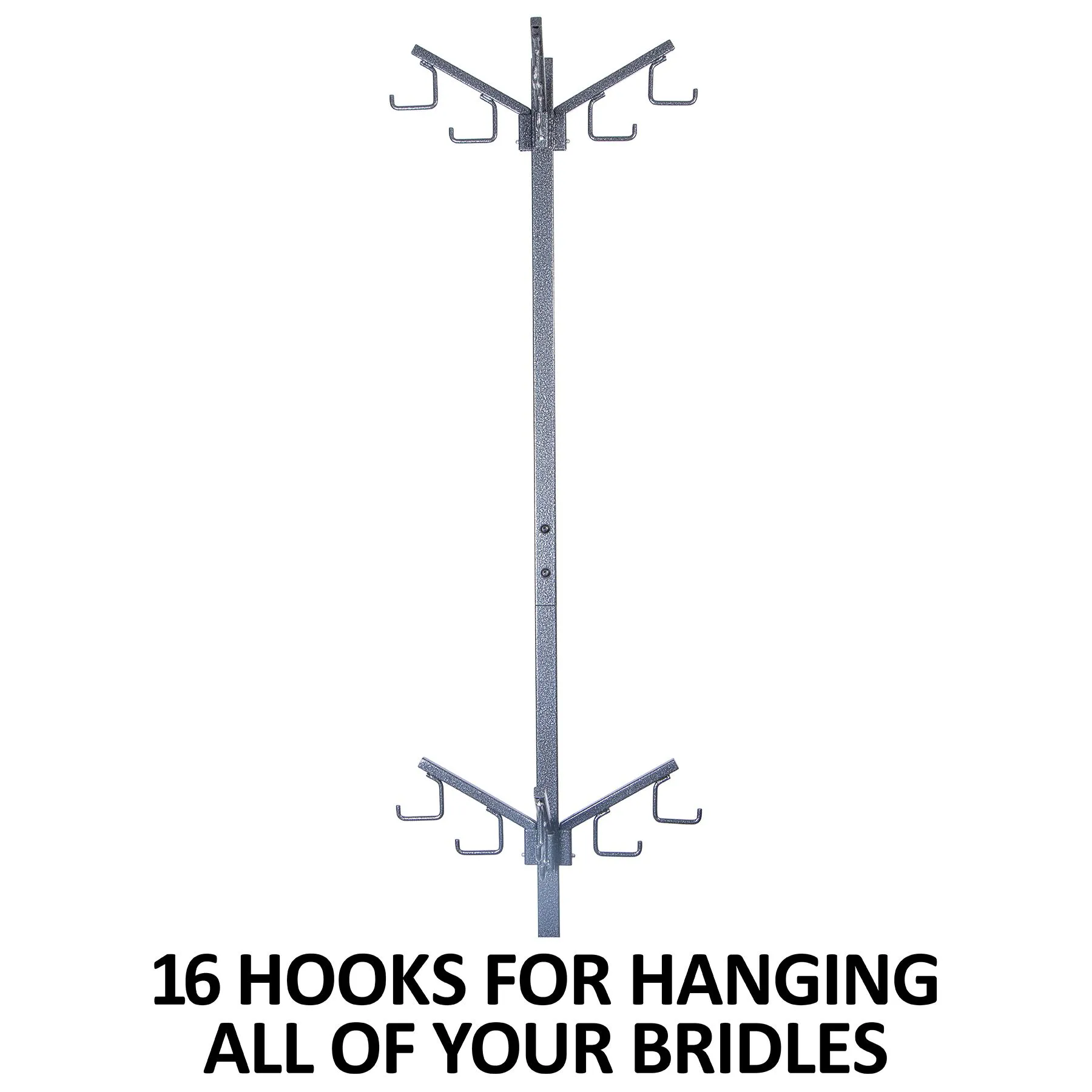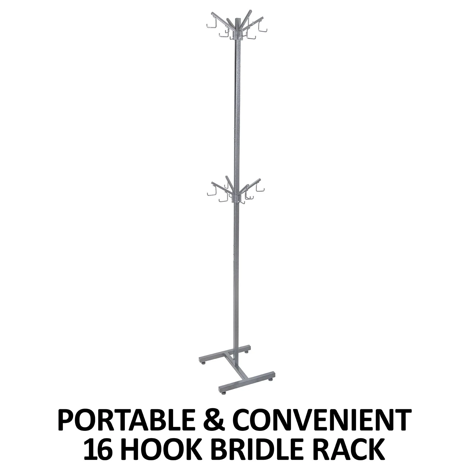Portable, stand up bridle rack that holds at the least 16 bridles, with room for more when doubling up per rack. An excellent option for busy barns, and horse show tack room set-ups. Measures 75″ T x 14″ W.