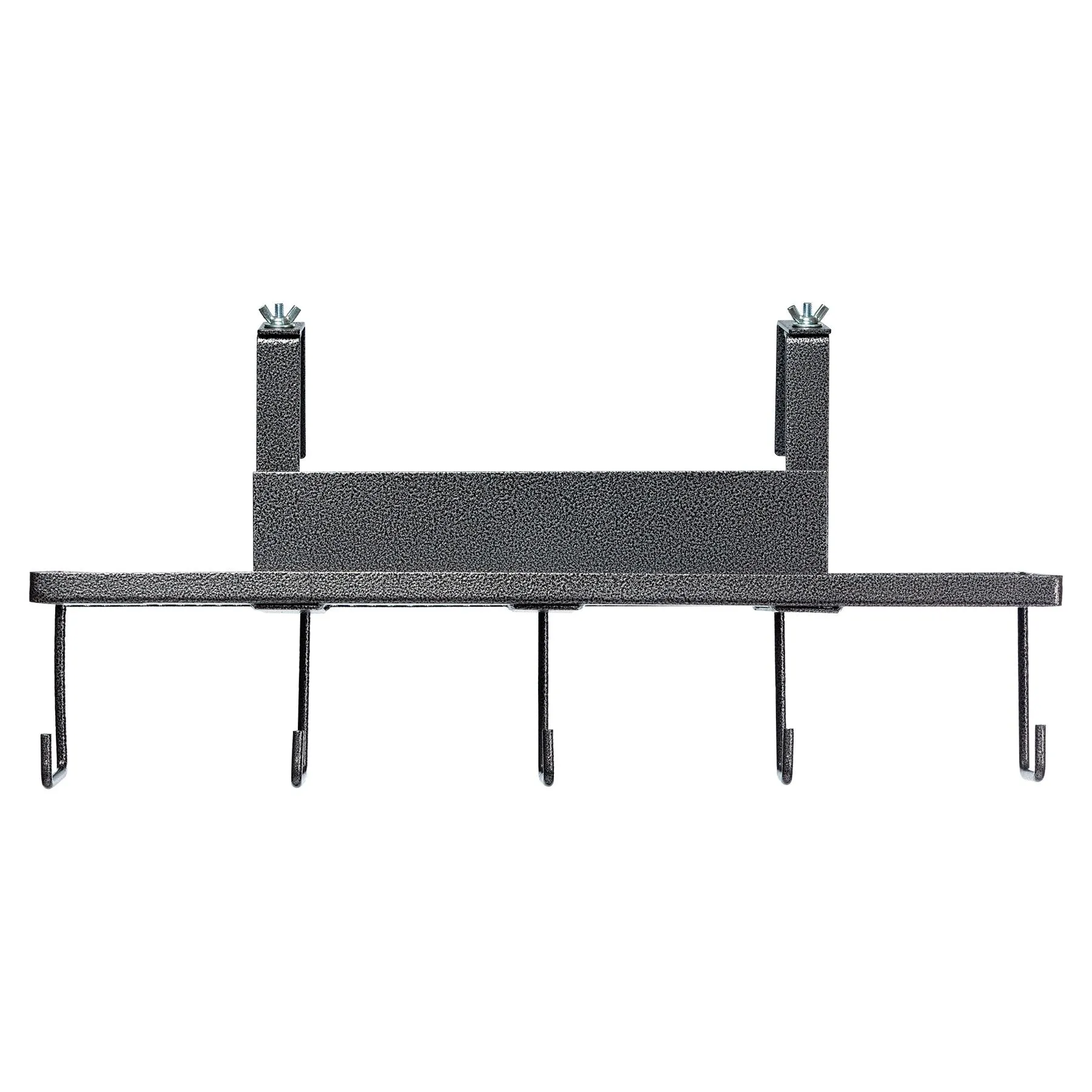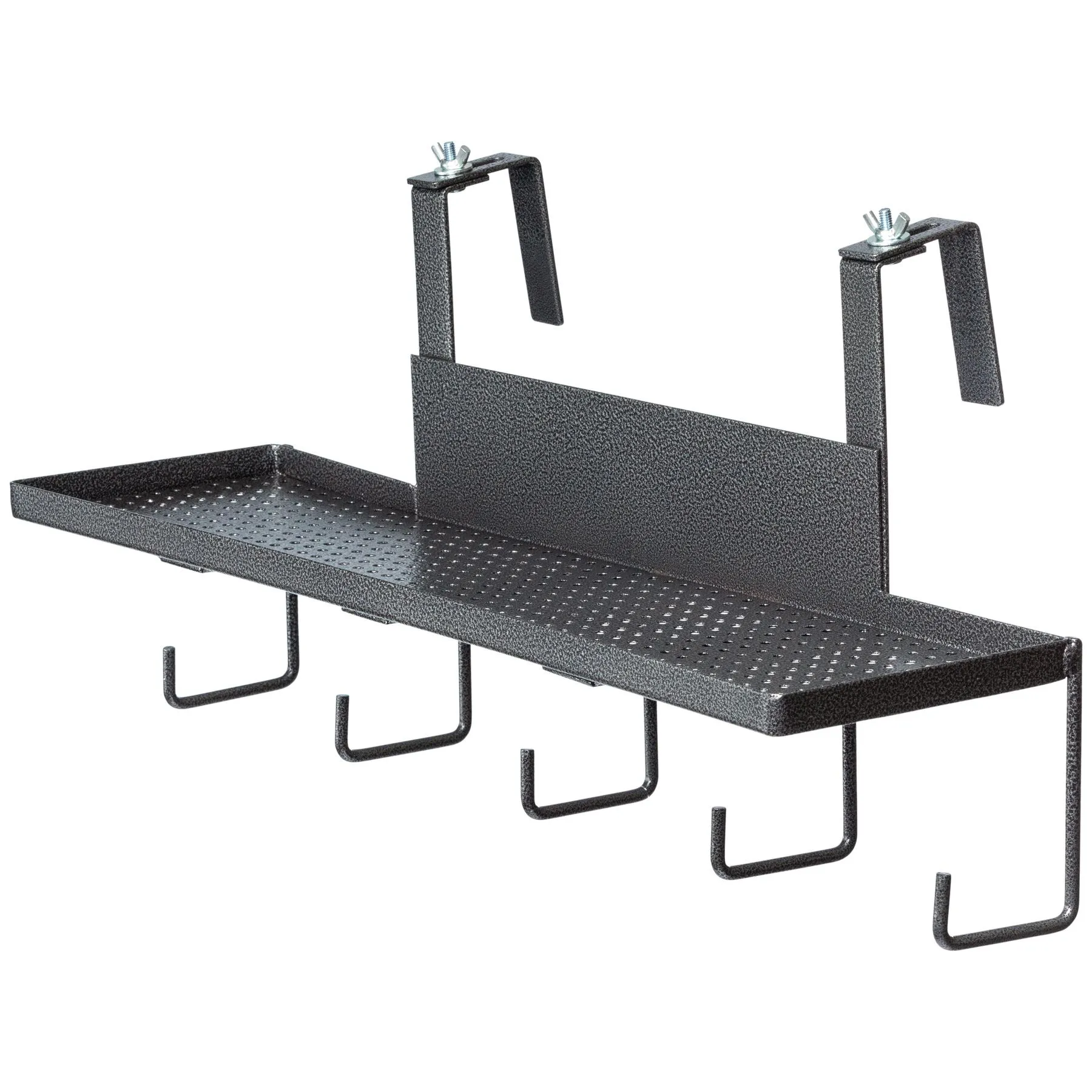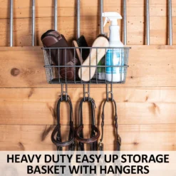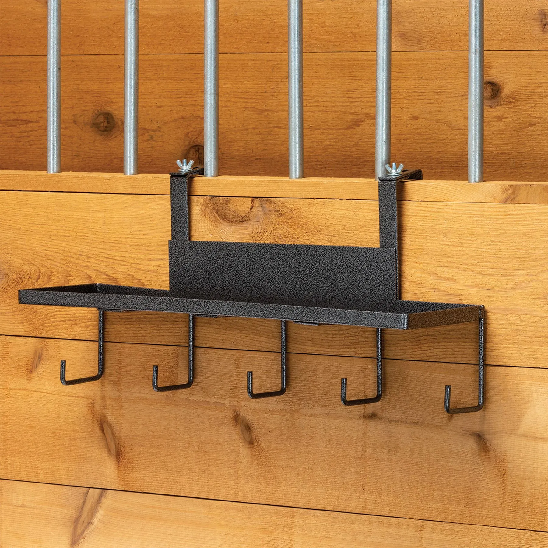 This handy, adjustable, portable shelf is large enough to hold grooming supplies, wraps, and water bottles on the shelf while the five tack hooks below organize halters, bridles, jackets, crops, spurs, and more. The adjustable hangers slide easily and lock into place with wing nuts, allowing use on everything from narrow portable stalls to large pipe rails.This multi-purpose shelf will keep all your most needed supplies organized and within reach at home, in the trailer, at shows or while in the pen. Constructed of durable armor coated steel for exceptional strength and durability, the shelf carries an industry leading Easy-Up® 7-year warranty against breakage.