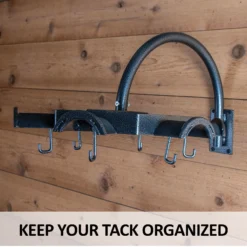 - 5 tack hooks under shelf to organize halters, bridles, jackets, crops, spurs, and more