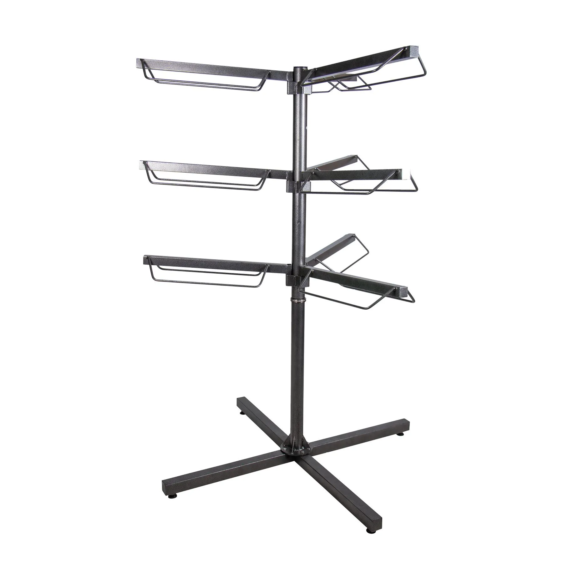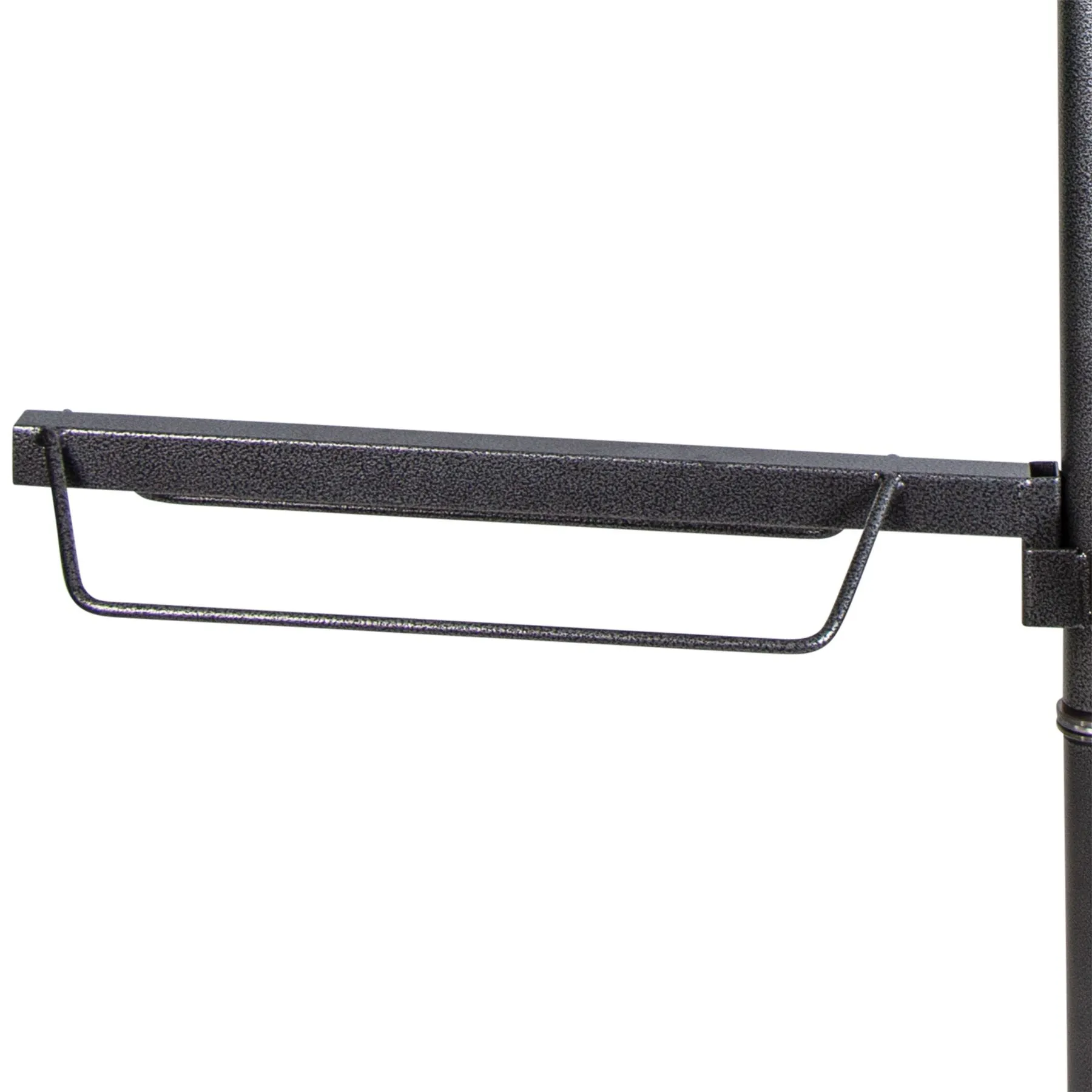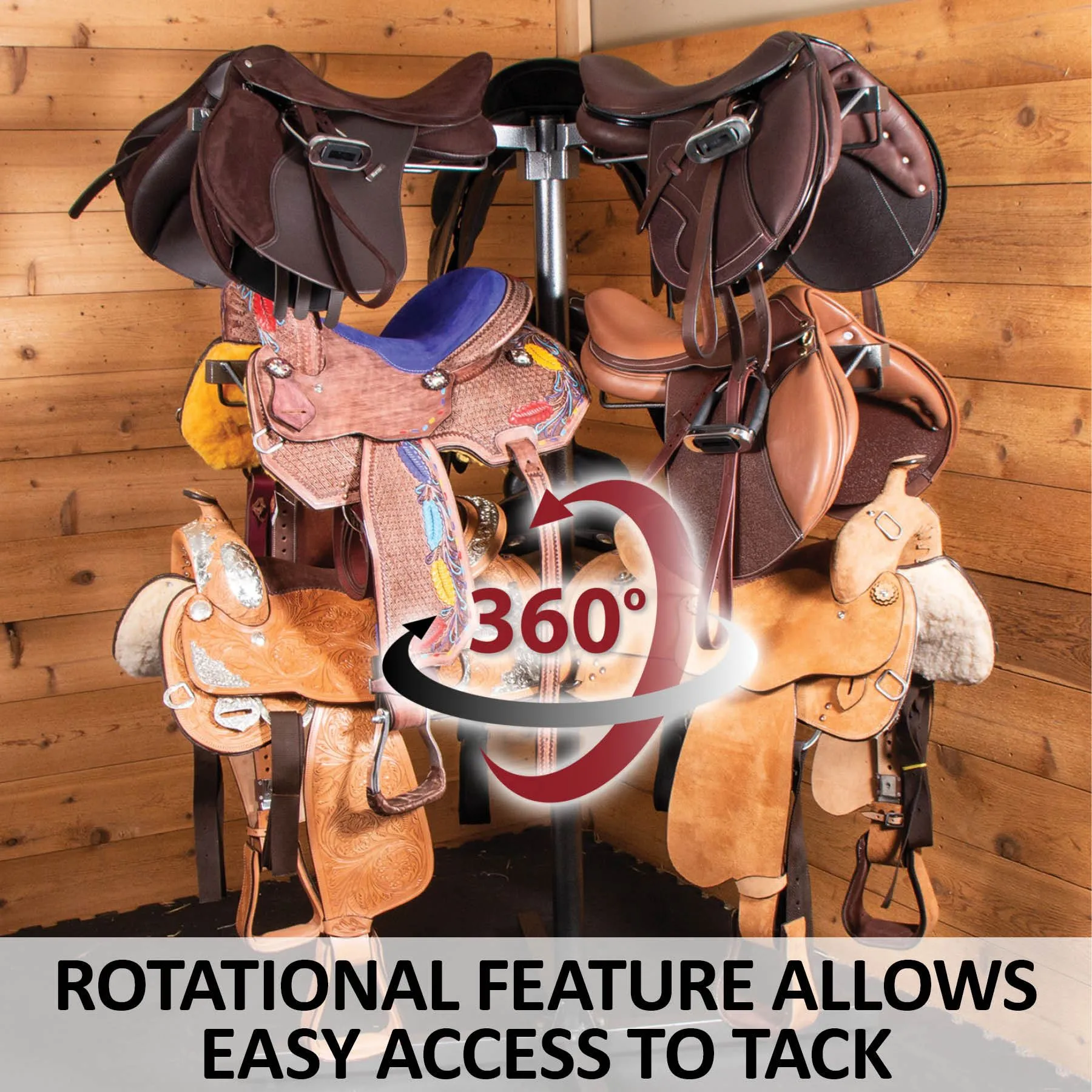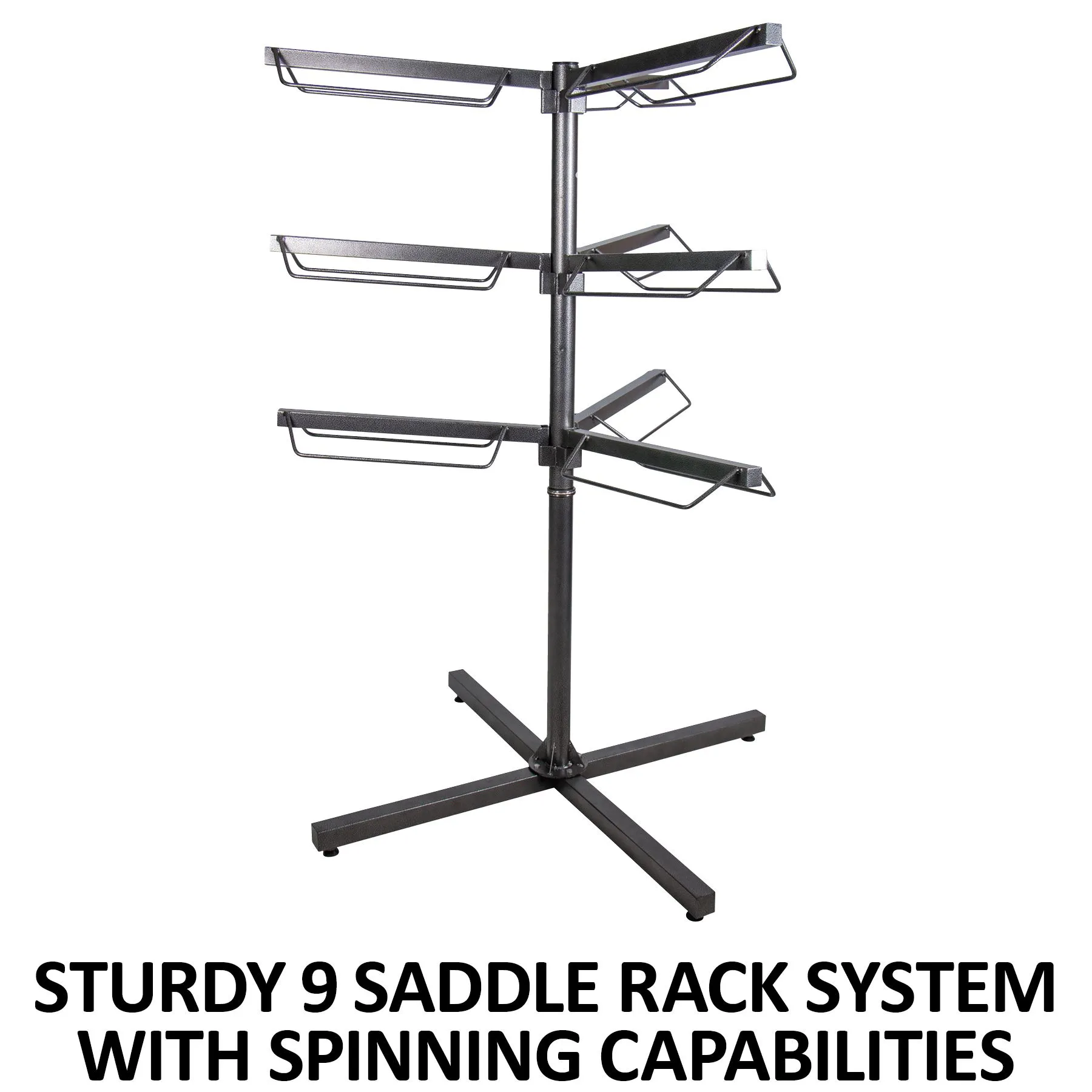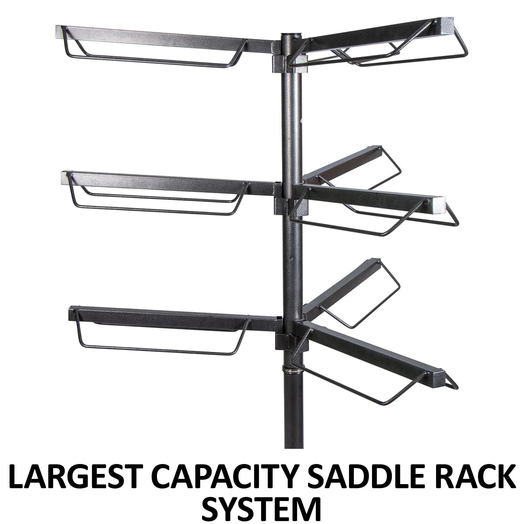 Fit up to 9 saddles on this large organizational rack system. Saddle racks are 25″ long x 9″ wide with the correct angles to support both English and Western saddle skirts. 14 1/2″ space clearance between each rack, while the bottom rack sits 38″ above floor so your stirrups stay off of the ground.