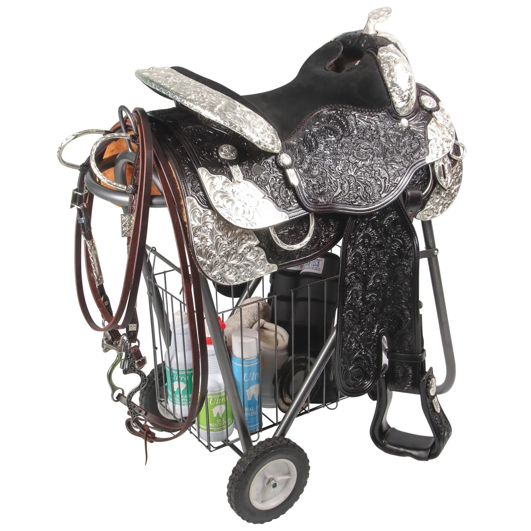 Transporting your heavy equipment has never been easier. Perfect for storing saddles at home, moving from tack room to the trailer and from the trailer to your show stalls. The Saddle Caddy Wheeler is made of 1″ galvanized steel tubing and has 8″ hard rubber wheels. It is sturdy enough to hold the heaviest Western saddle. The basket underneath is removable and holds grooming supplies and necessities. Conveniently folds flat for easy storage when not in use. Easy Up features an industry leading 5 year warranty against breakage