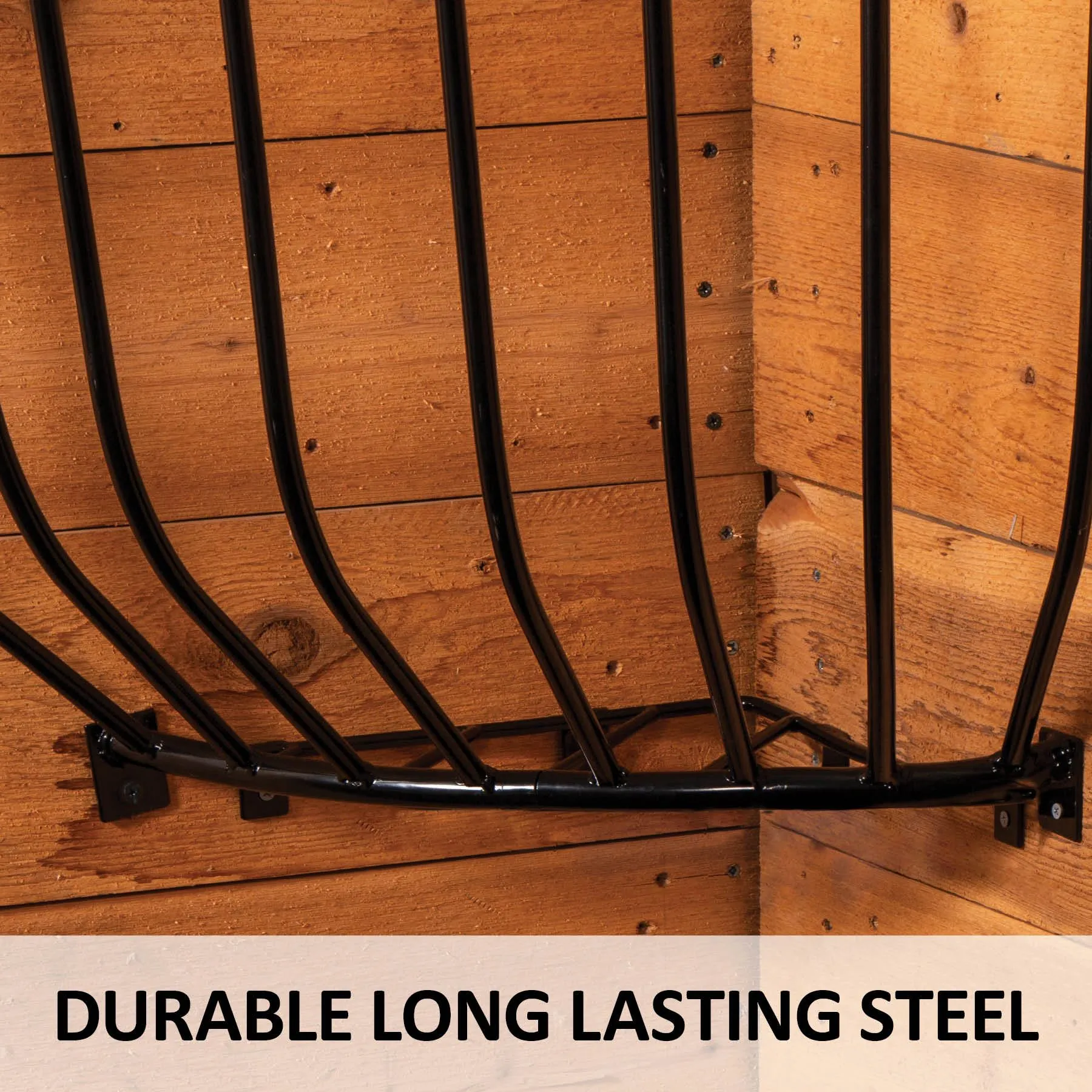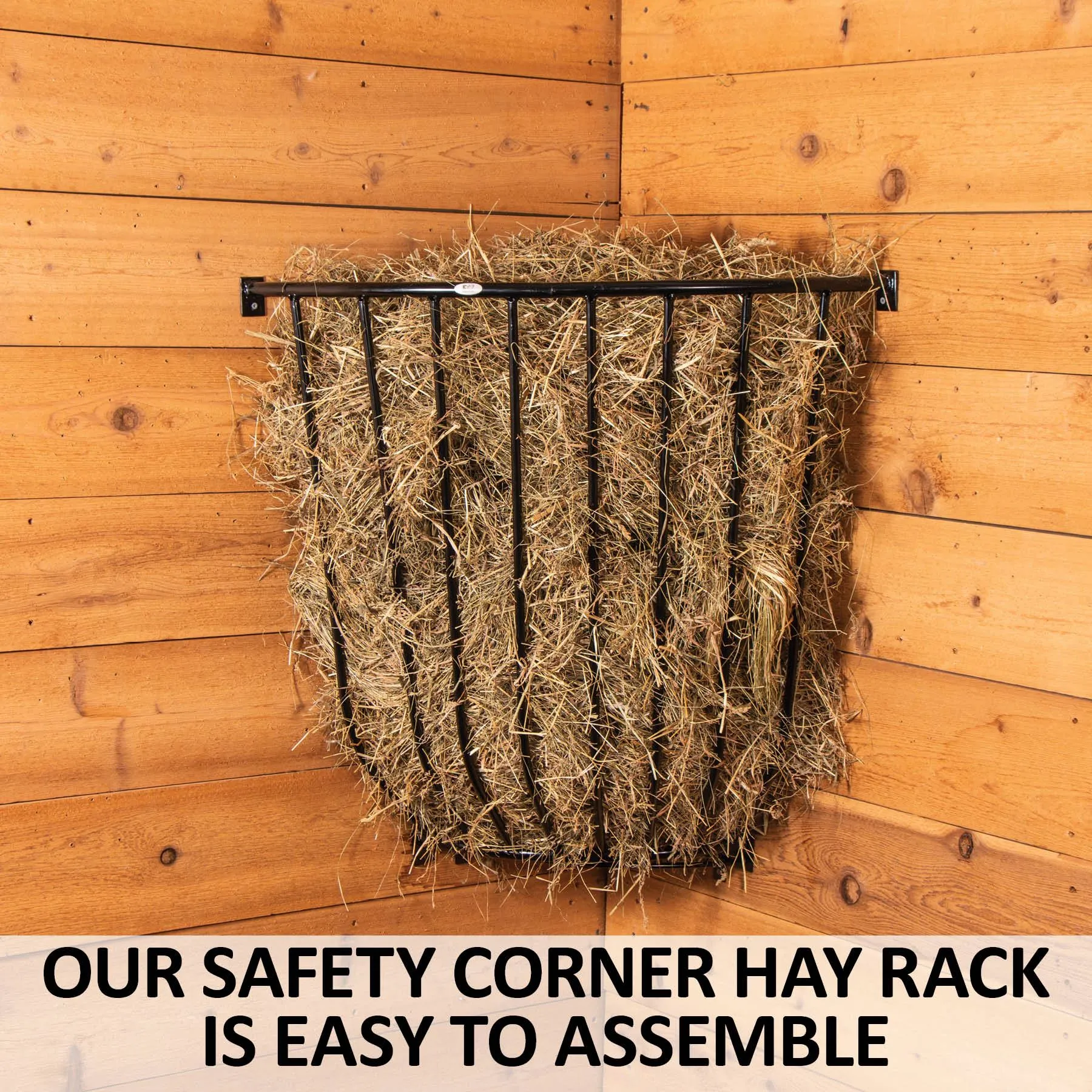 Safe rounded edges, 2″ spaced width between bars to promote a slower more natural way of eating, and fits 3 flakes of hay. This corner hay rack helps eliminate wasted hay while promoting the natural prolonged periods of “grazing” for your horse. Measures 30″H x 35″W x 23″D at top (12″ at bottom)