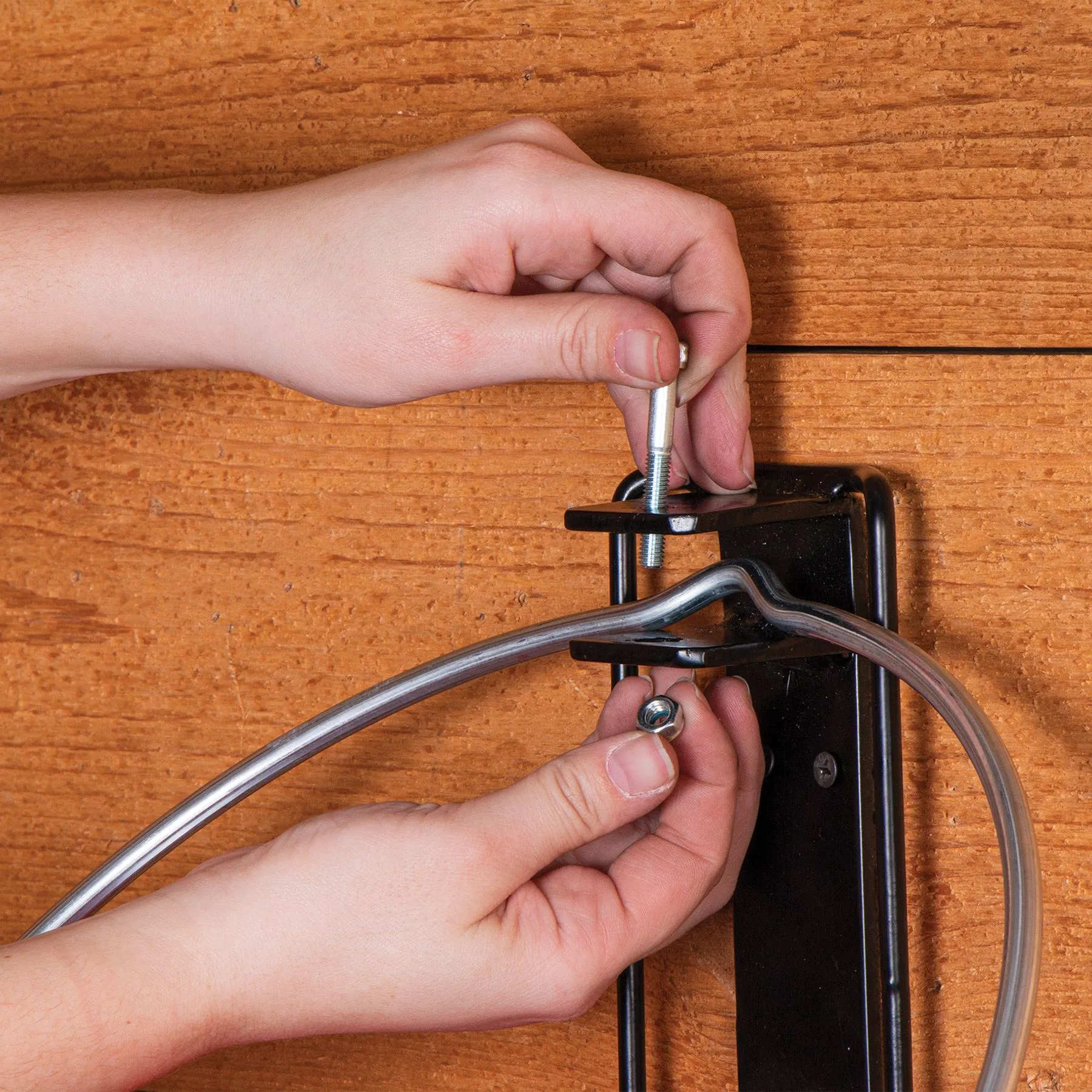 Wall mounted bucket holder comes with mounting hardware and securely holds your bucket to the wall. A great way to secure your buckets from playful horses or those that swing their buckets.