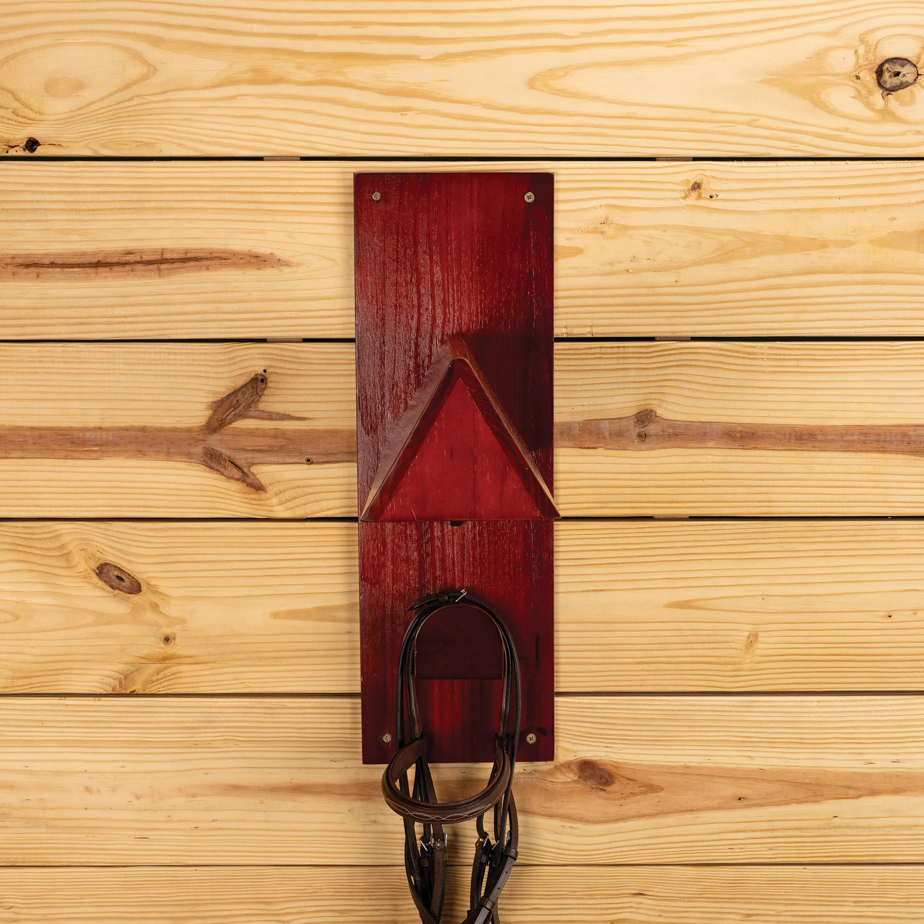 - Wooden wall-mounted English saddle rack with A-frame design