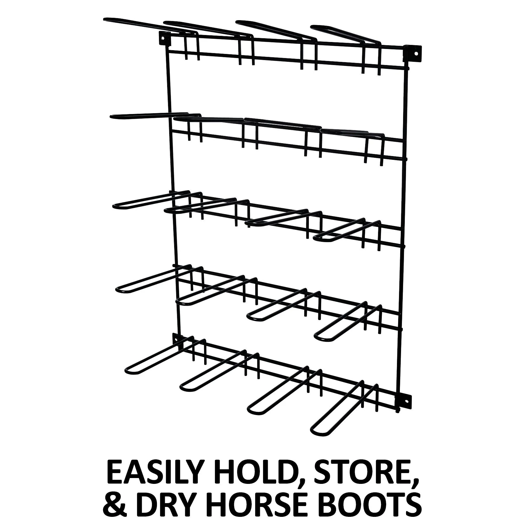 Designed to hold all styles of horse boots! This rack is excellent for storing and drying used boots after workouts or washing and keeping your boots organized. The larger frame now fits up to 10 pairs (20 total) of horse boots!