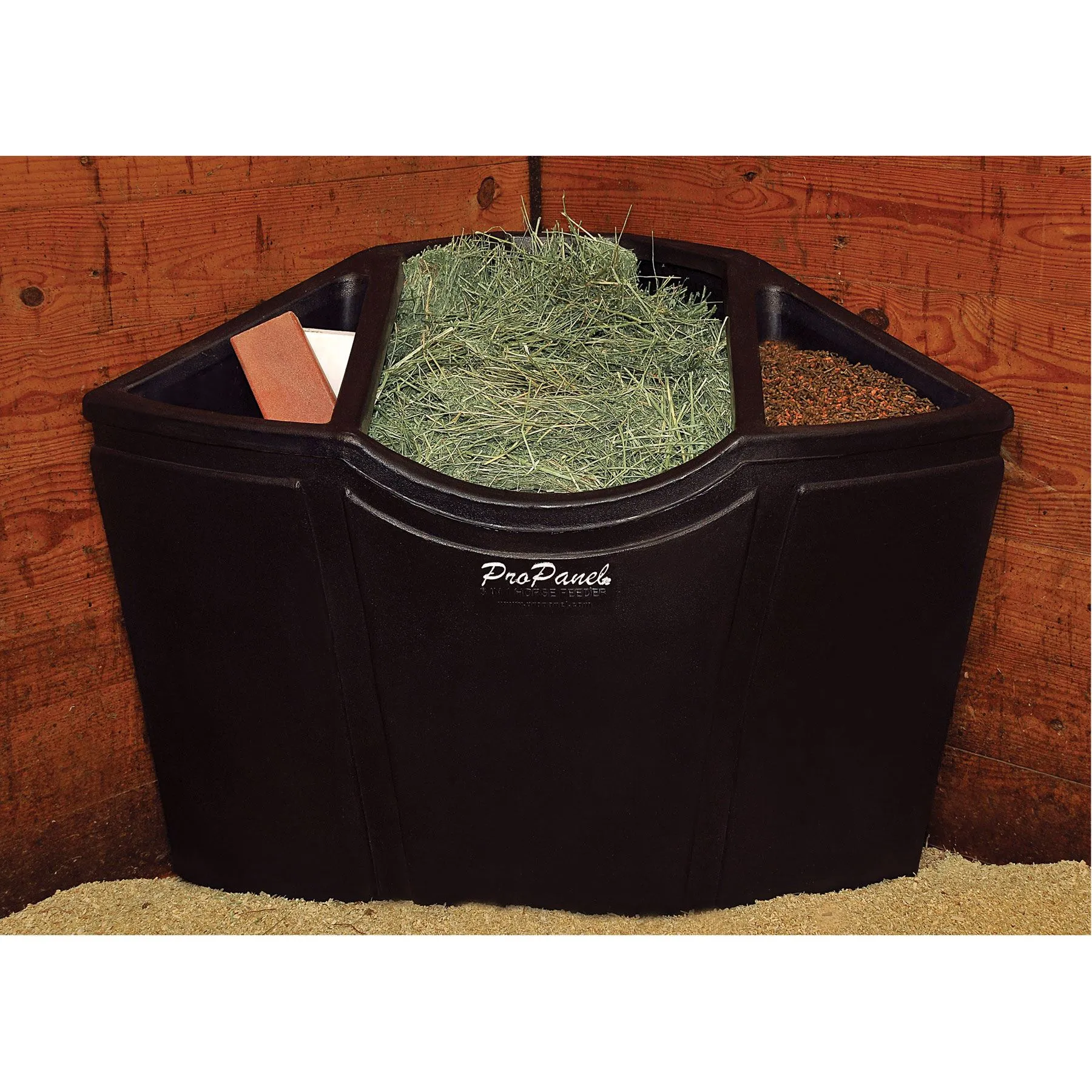 The Pro Panel Stall Grazer 3-in-1 Corner Horse Feeder is an ultra-durable feeder designed to sit at ground level and allow your horses to eat comfortably in their natural grazing position. It’s ideal for use inside box stalls or outside your barn in mare motels and runs. Horses are healthier and happier and keep the hay in the feeder, not out on the ground or stall floor. The savings in hay, shavings, and labor can easily return the cost of the feeder again and again. More Million Dollar Riders, veterinary clinics, and equine universities use the 3-in-1 feeder than any other horse feeder on the market today, attesting to how well this horse feeder performs.